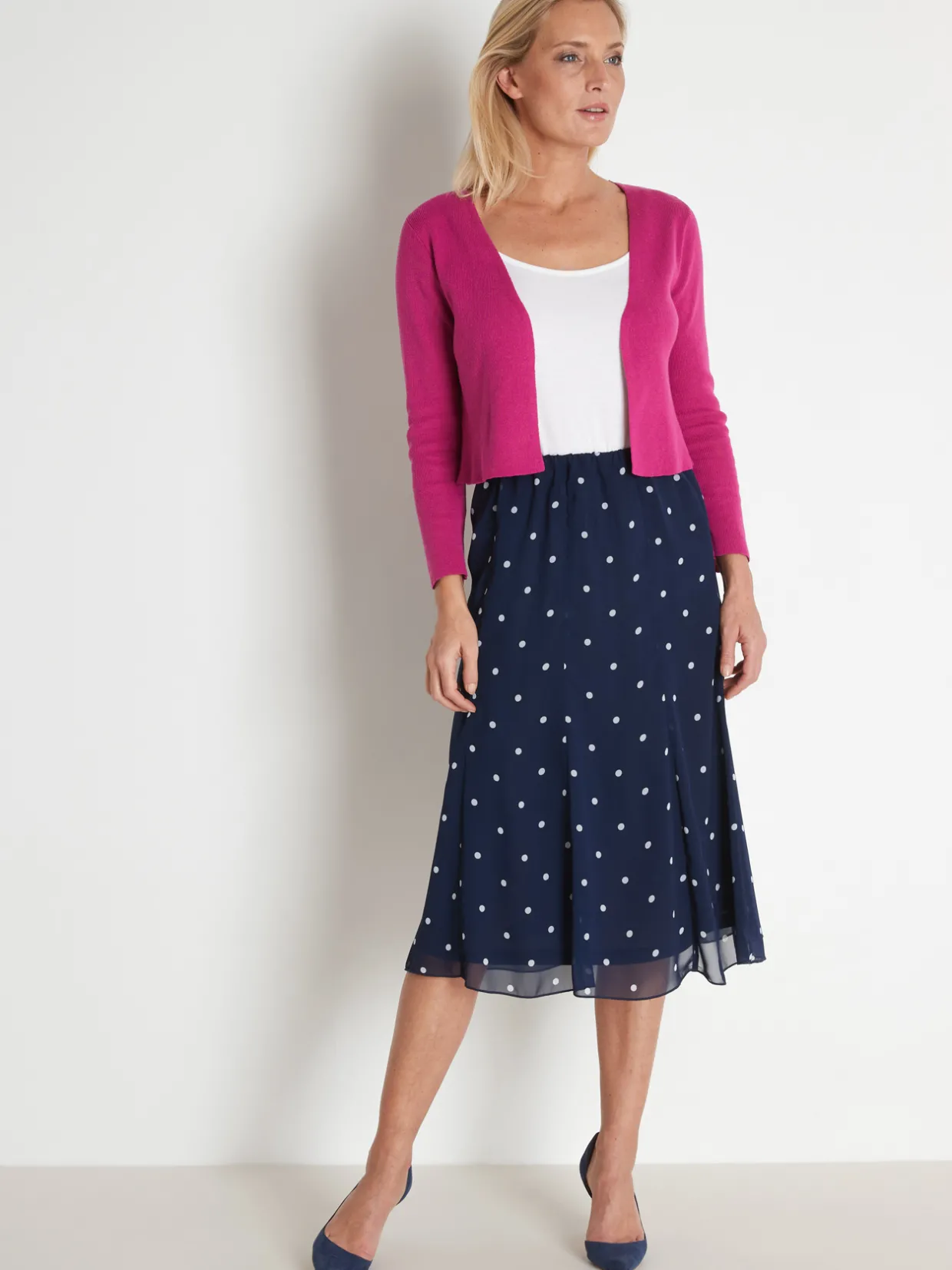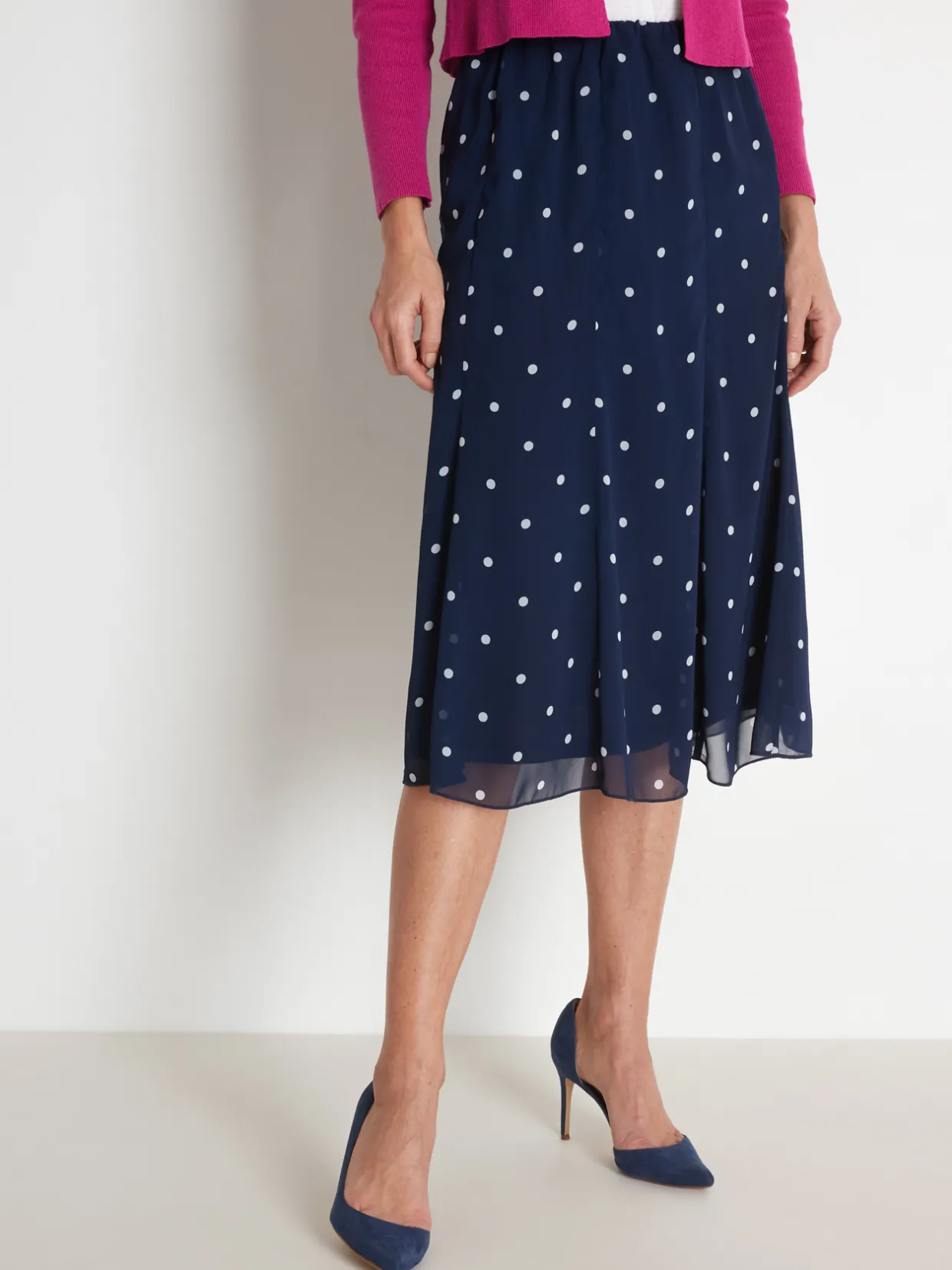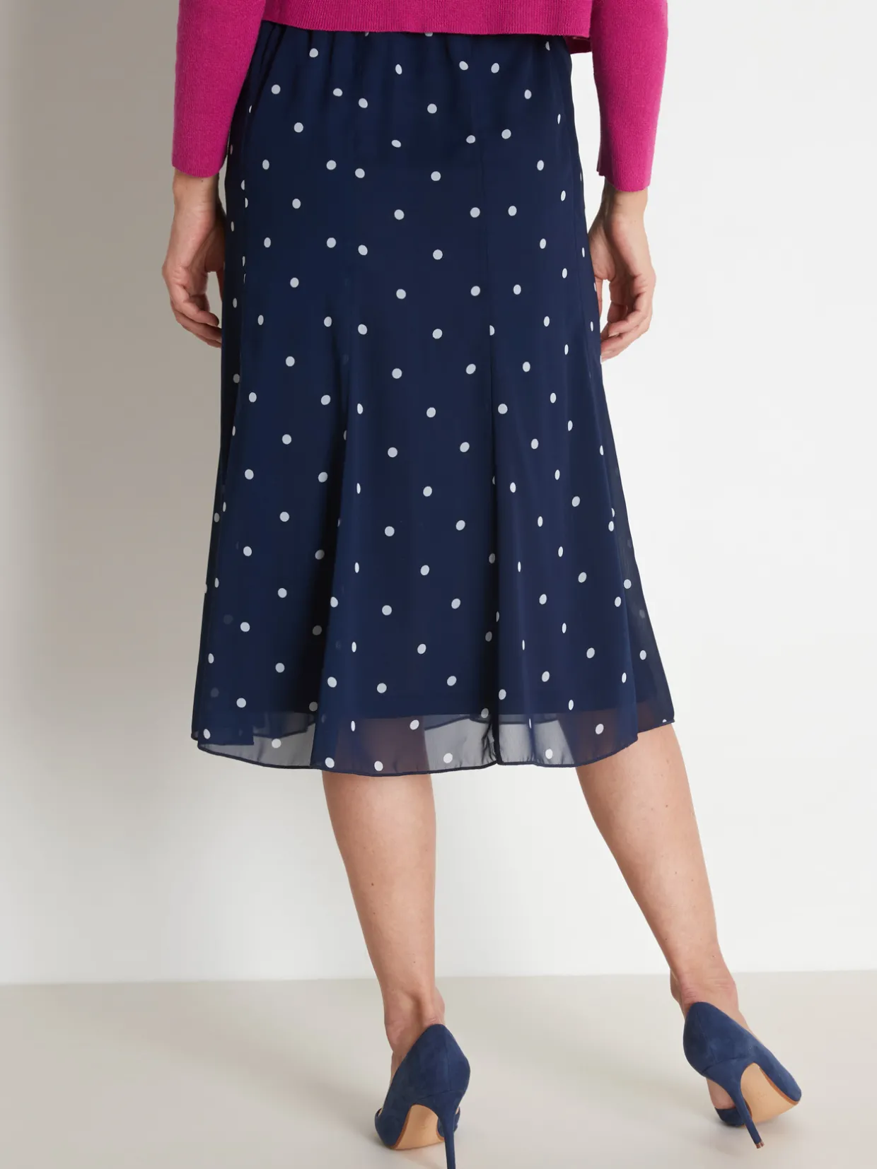 Jupe à pois en voile doublé de fine maille, 100% polyester.