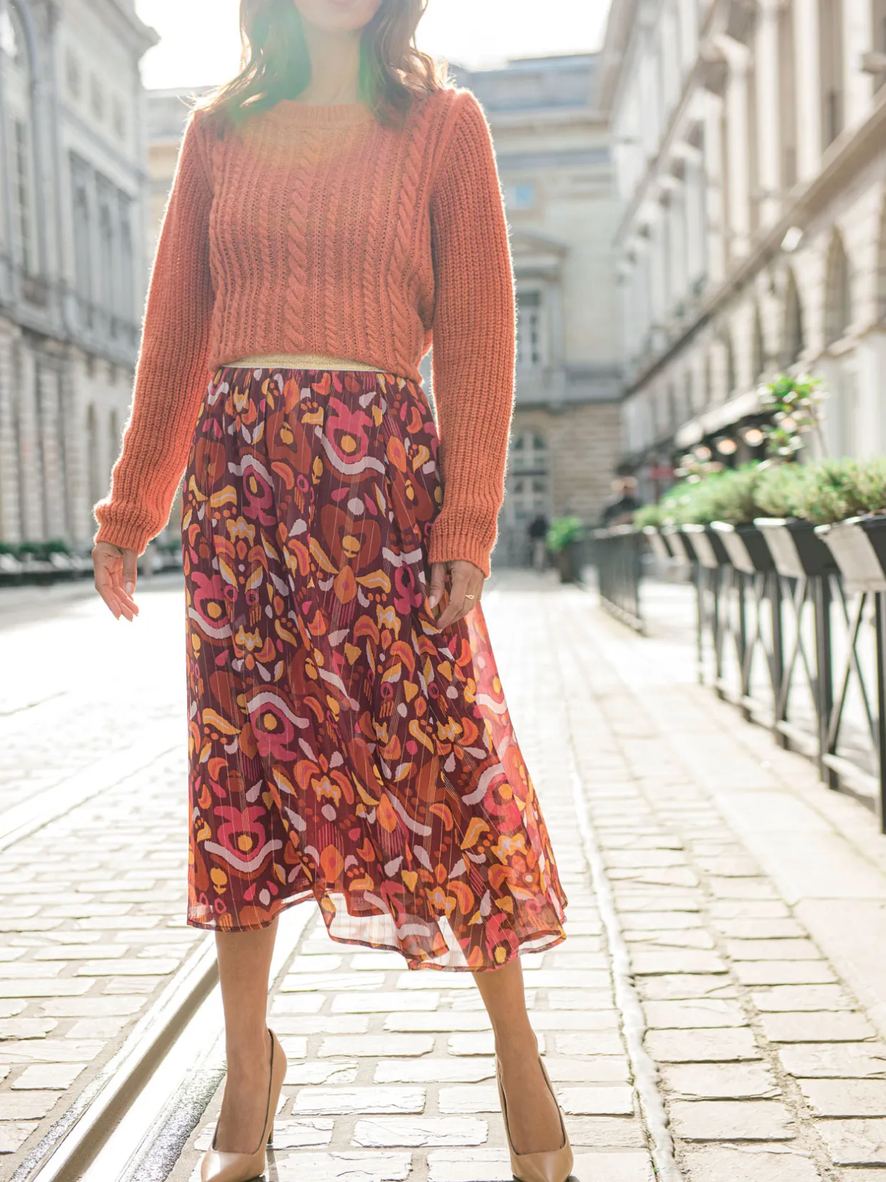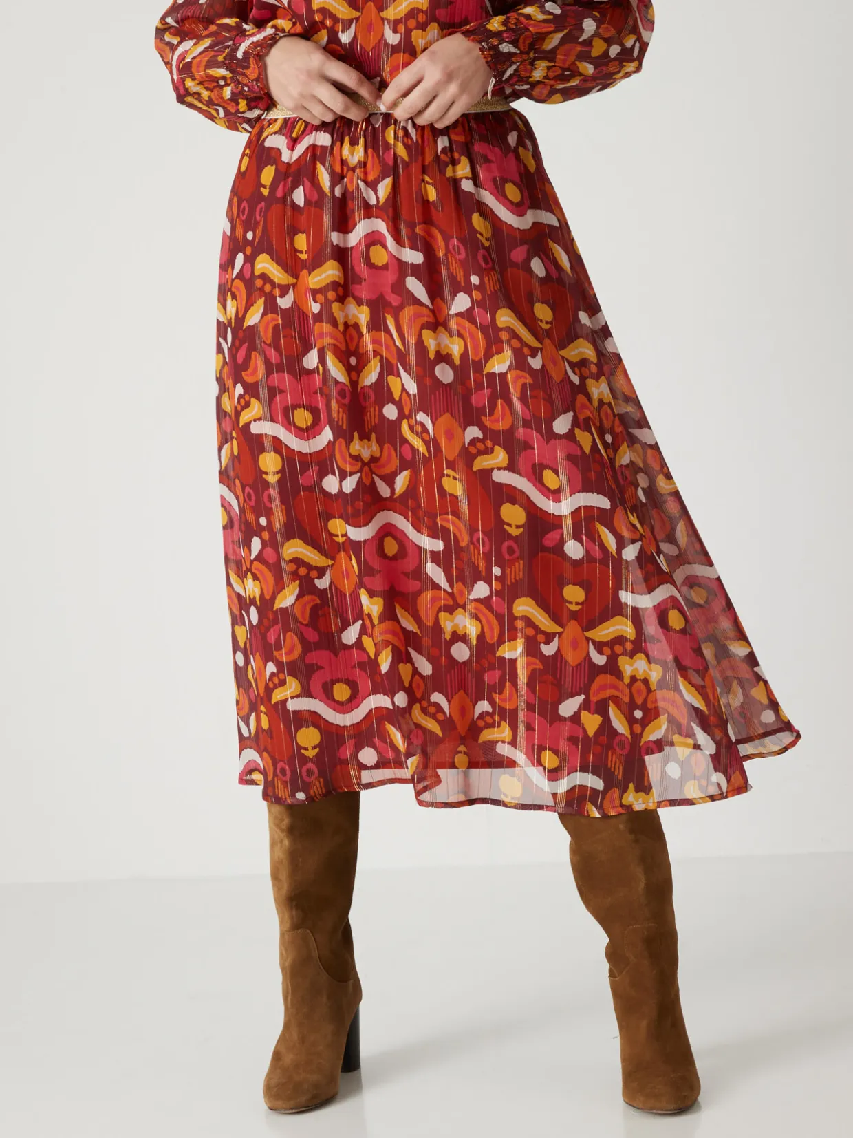 Une jupe longue, qui s’enfile en un clin d’oeil grâce à sa ceinture entièrement élastiquée. On l’associe à une blouse, ou comme nos stylistes, on aime la porter avec un pull, semi-rentré pour suivre la tendance !