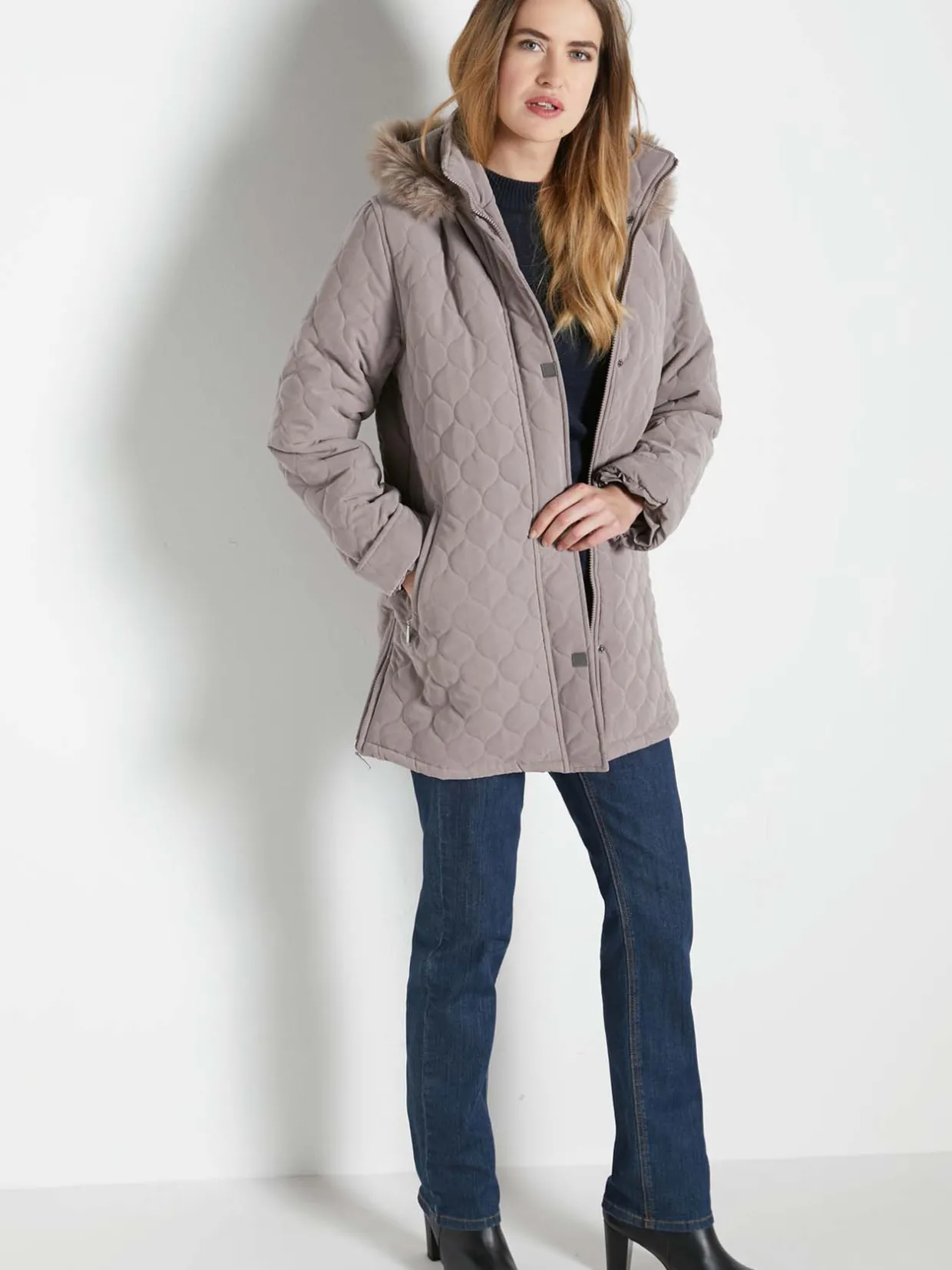 Glissière sous patte pressionnée jusqu’en haut du col. Capuche amovible bordée d’imitation fourrure (66% acrylique, 21% polyester, 13% modacrylique). 2 poches en biais passepoilées zippées. 2 fentes zippées à la base. Manches longues avec revers ajustable.