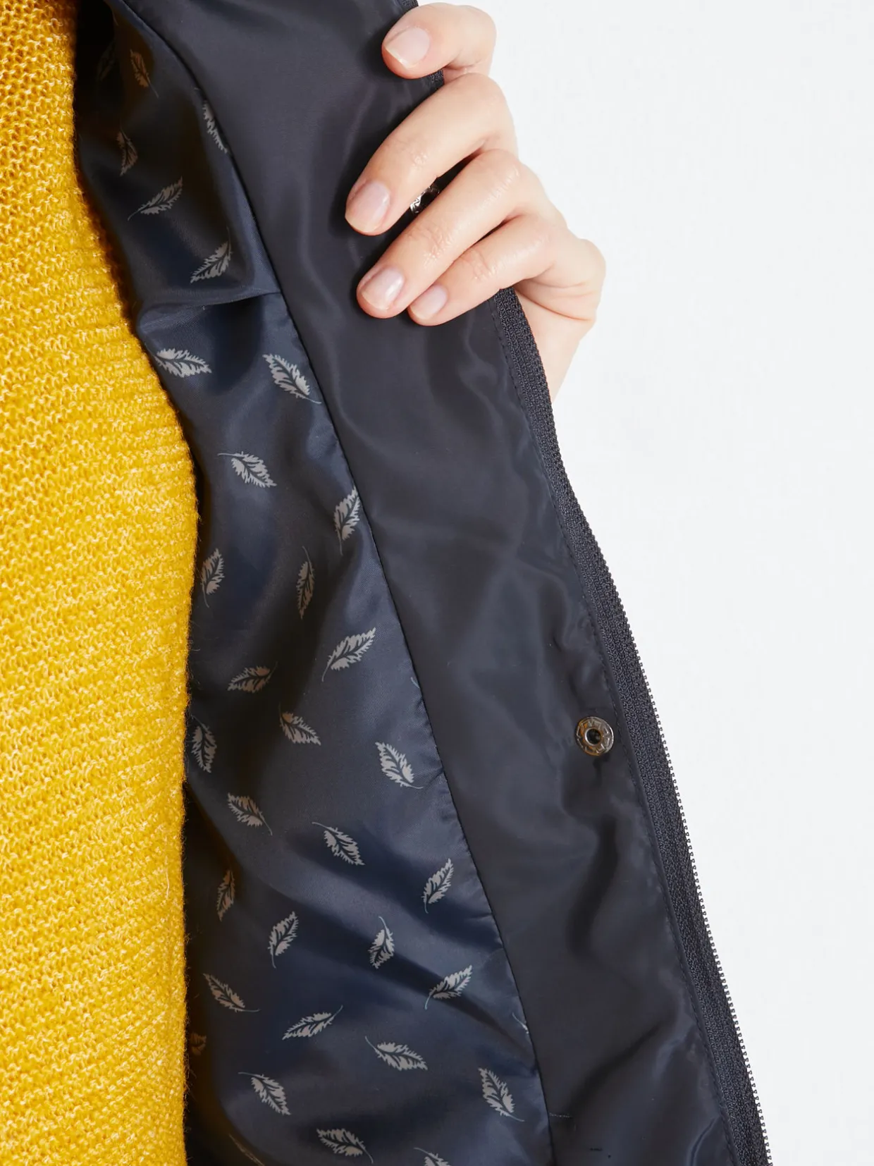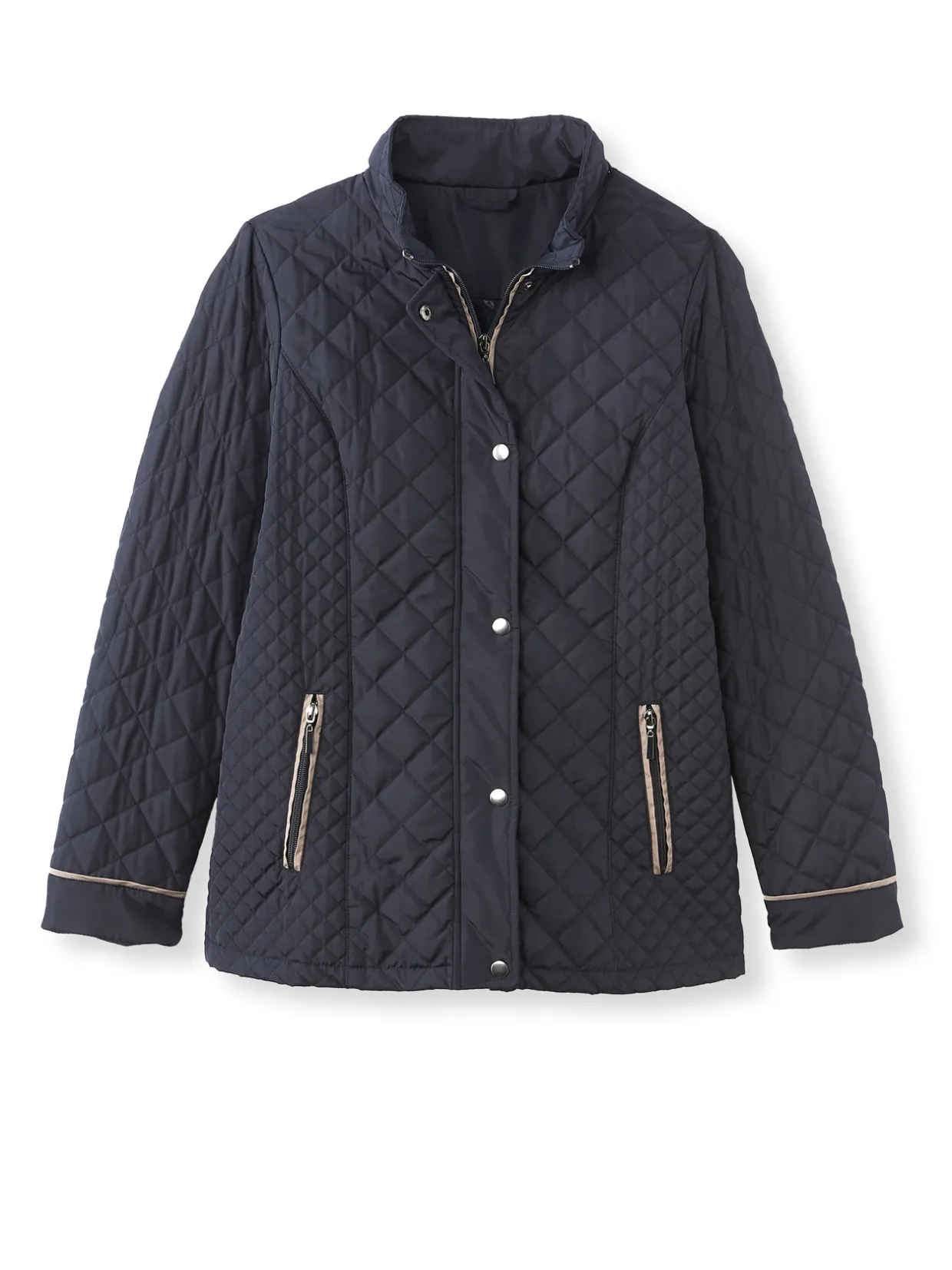 Fermée par zip sous patte pressionnée jusqu’en haut du col montant. Découpes princesse surpiquées devant et dos. Poches en biais passepoilées zippées. Manches longues. Finitions passepoil contrastant.