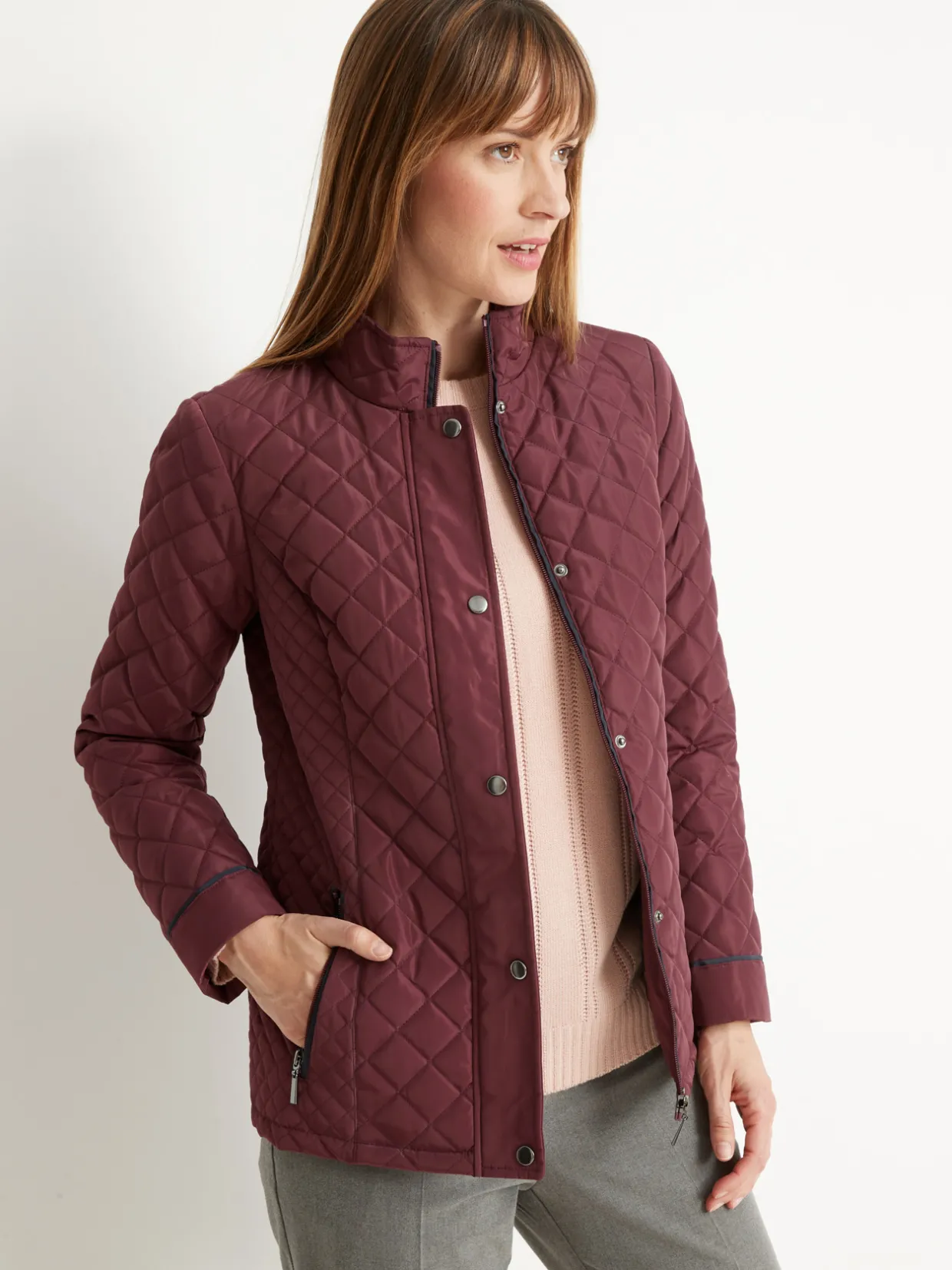 Fermée par zip sous patte pressionnée jusqu’en haut du col montant. Découpes princesse surpiquées devant et dos. Poches en biais passepoilées zippées. Manches longues. Finitions passepoil contrastant.