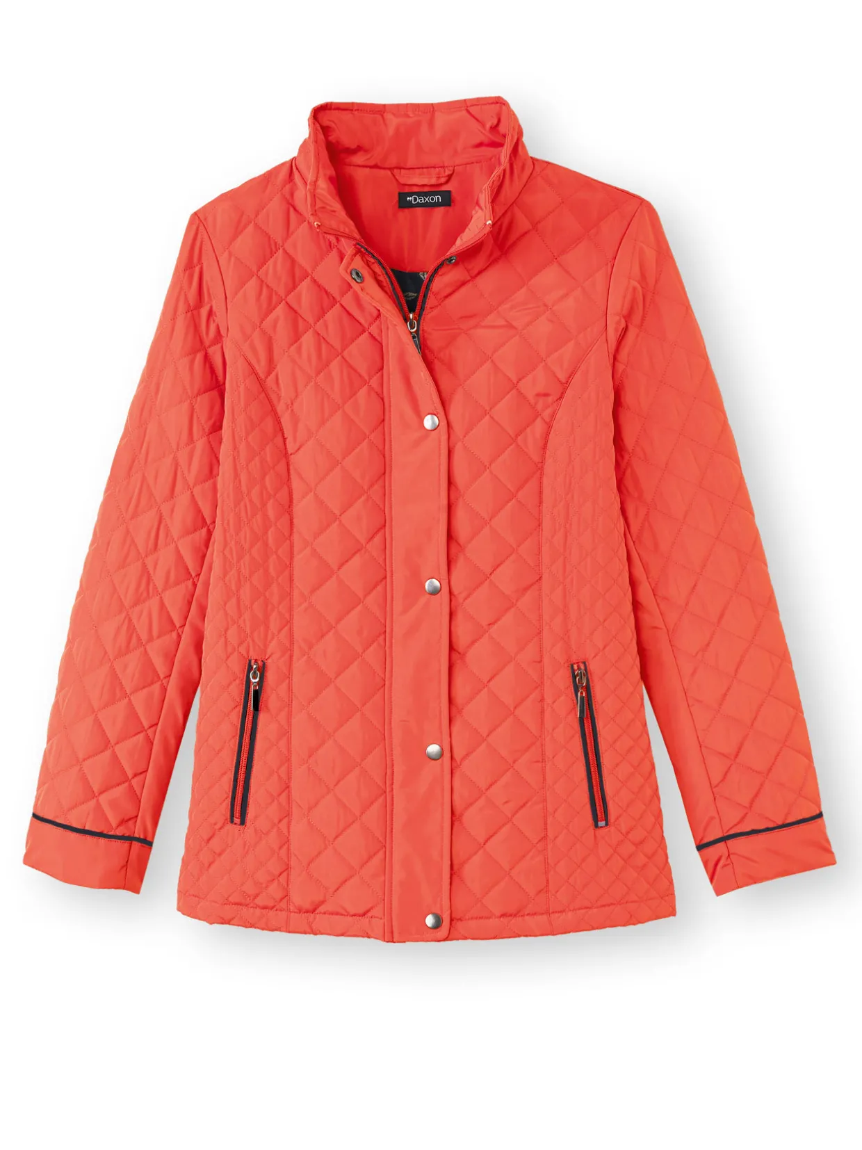 Fermée par zip sous patte pressionnée jusqu’en haut du col montant. Découpes princesse surpiquées devant et dos. Poches en biais passepoilées zippées. Manches longues. Finitions passepoil contrastant.