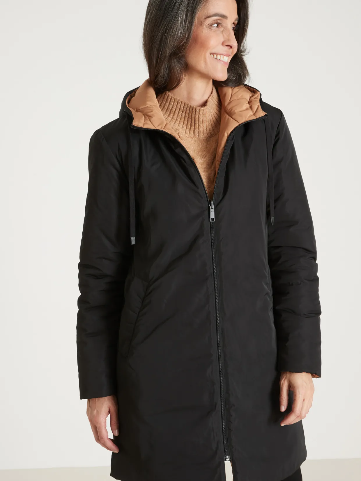 Vous allez adorer cette parka réversible, qui vous permet de changer de style en fonction de votre humeur ! Son côté noir en tissu lisse, est muni de 2 poches en biais passepoilées. Quant à sont côté camel, il révèle des surpiqûres matelassées, et il est muni de 2 poches dans les coutures côtés.