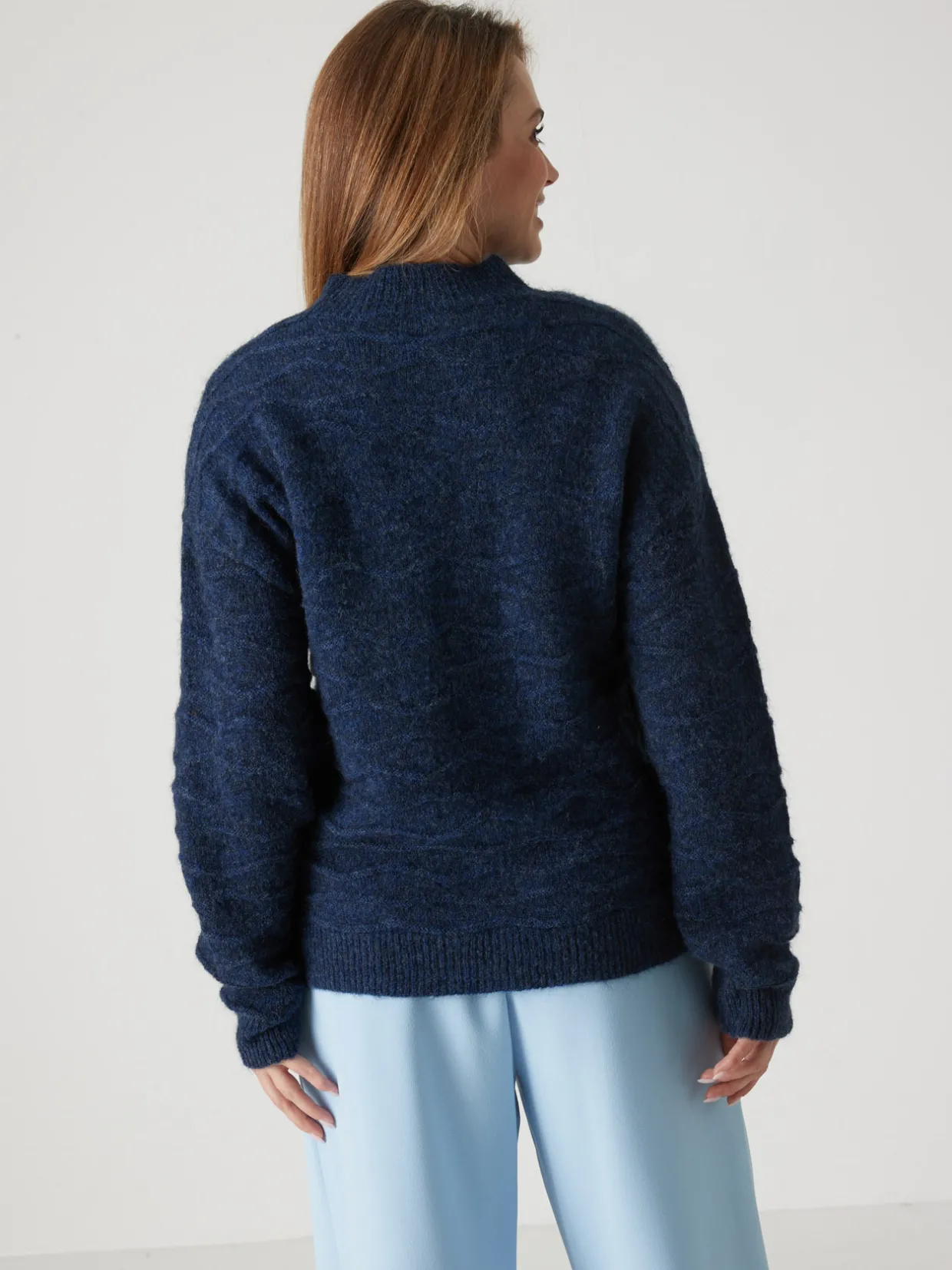 Ce pull col montant femme est conçu pour s’adapter à toutes les morphologies : petites et grandes tailles.