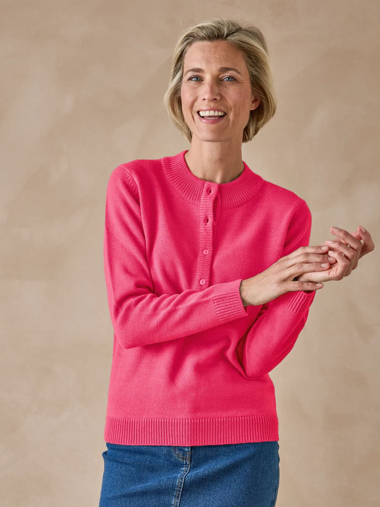Un pull uni facile à vivre, en maille douce. On aime son encolure tunisienne, avec une petite patte boutonnée. Ce pull classique est une bonne base du dressing.