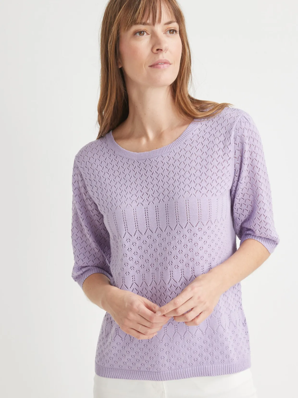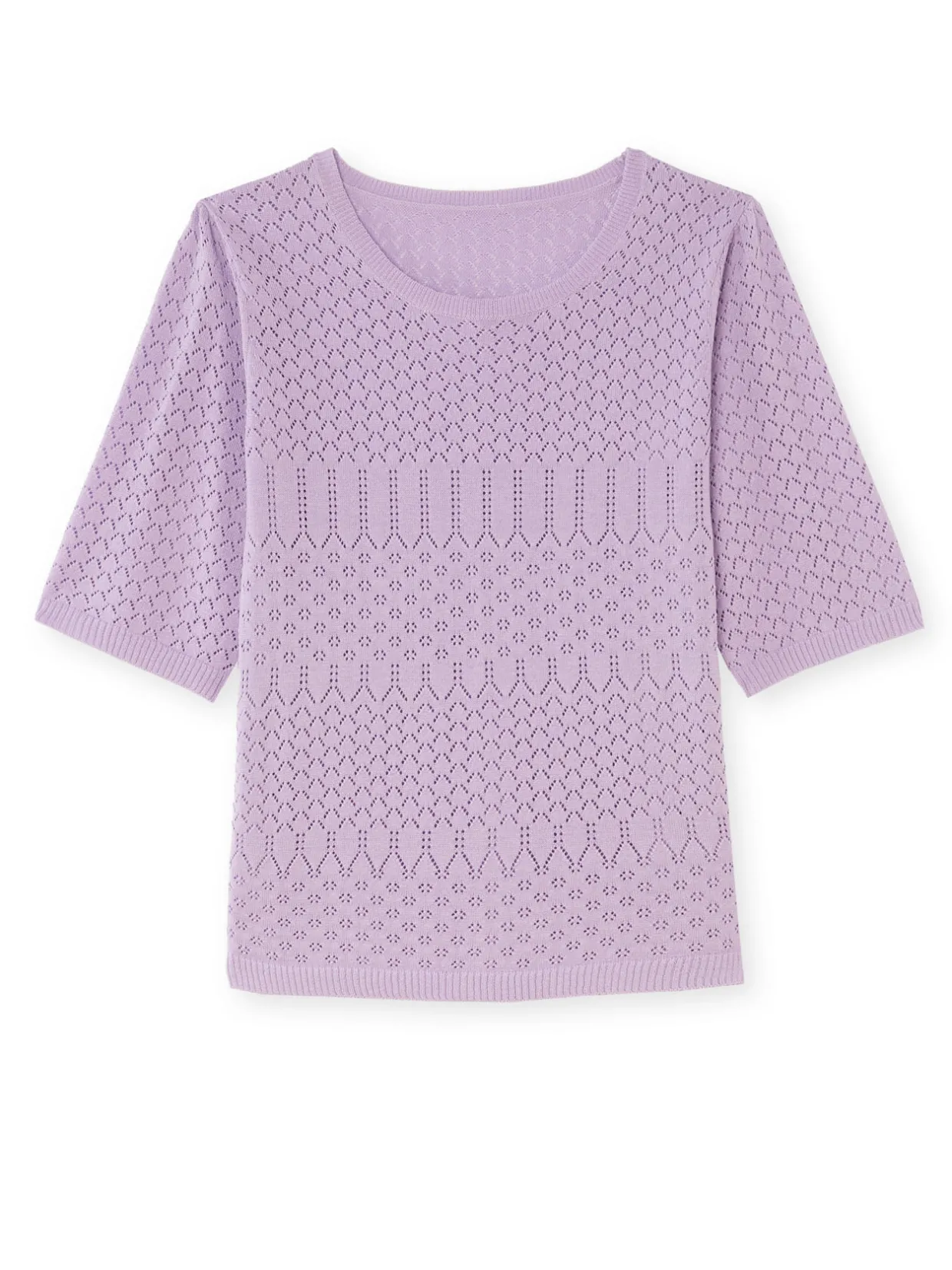 Encolure ronde. Jeu d’ajourés et de points fantaisie. Emmanchures semi-diminuées. Jolies manches au coude froncées. Finitions bords-côtes.