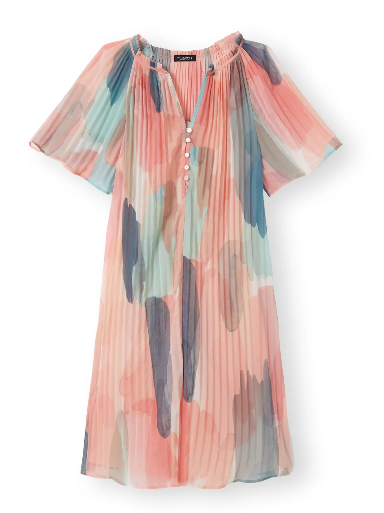 – Petits plis et biais uni le long de l’encolure ronde ouverte sur une découpe V avec petits boutons