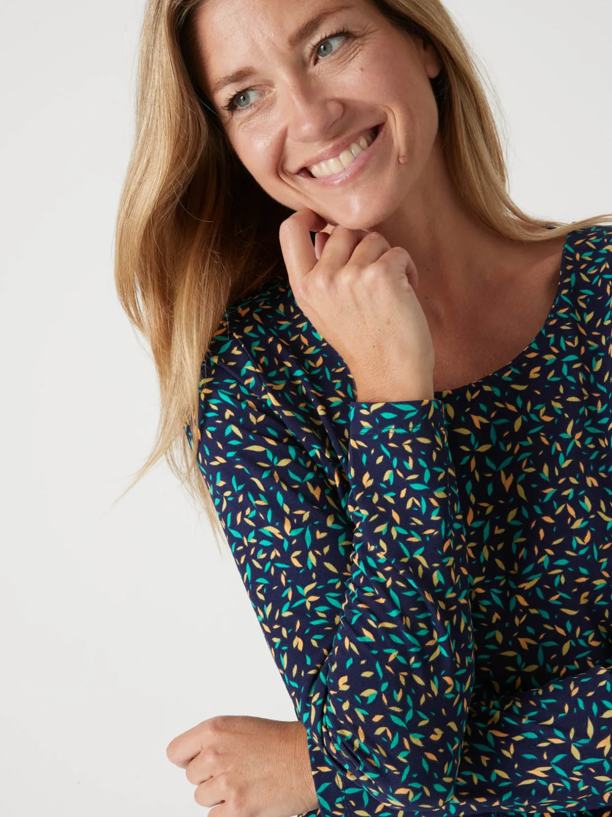 Cette robe manches longues s’habille d’un très joli imprimé et sa coupe joue, avec brio, le duo confort et style.