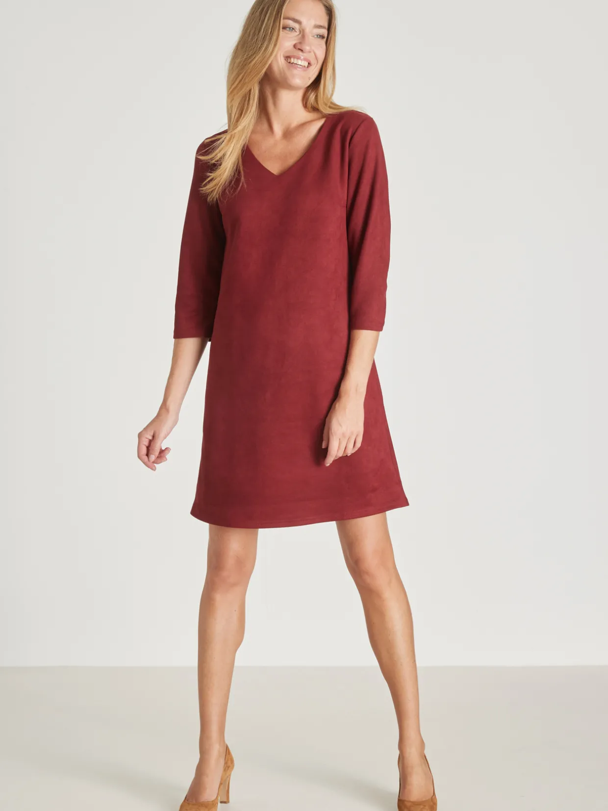 Cette robe maille suédine est conçue pour s’adapter à toutes les morphologies : petites et grandes tailles.