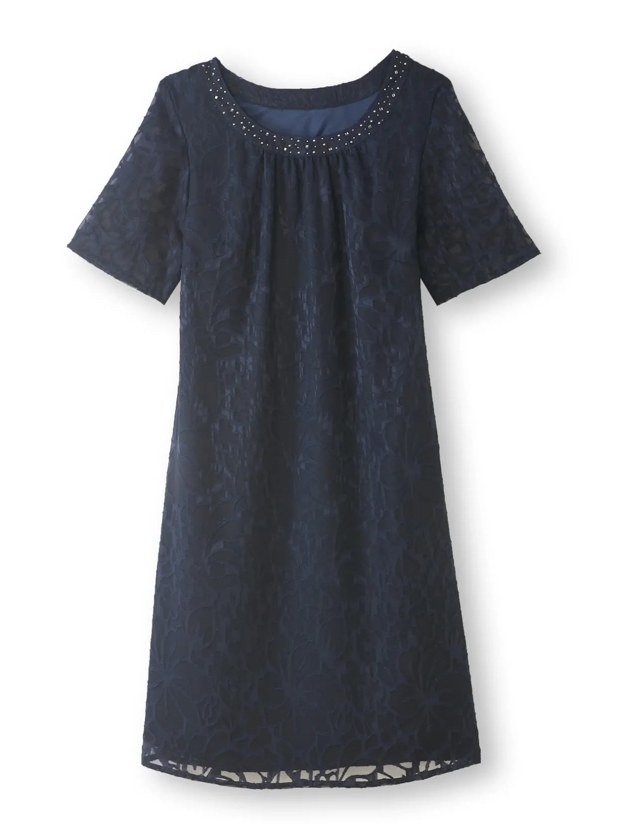 Un tissu dévoré (légèrement reliefé) effet dentelle pour cette robe marine parfaite pour une fête, une sortie, une cérémonie… Son encolure ronde est rehaussée de strass, dans un esprit très raffiné. Et son coloris marine est ulra chic !