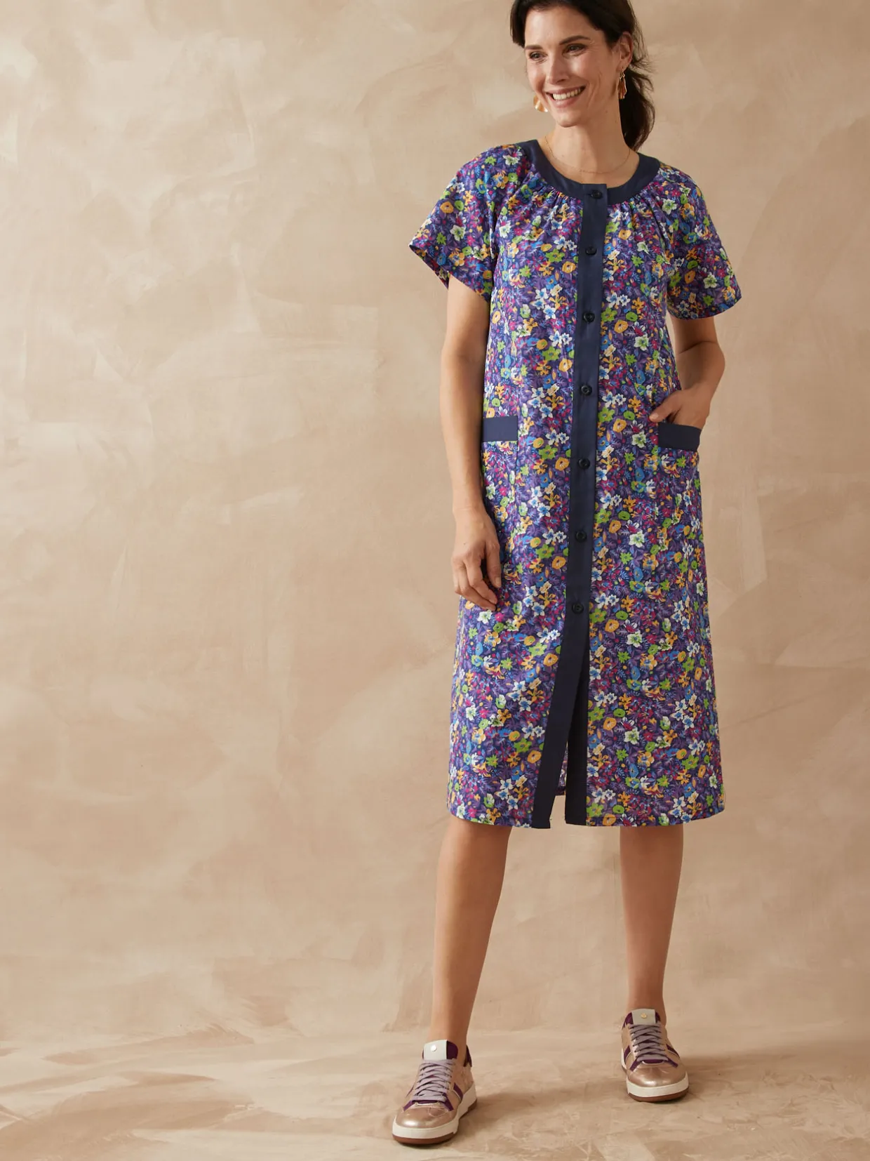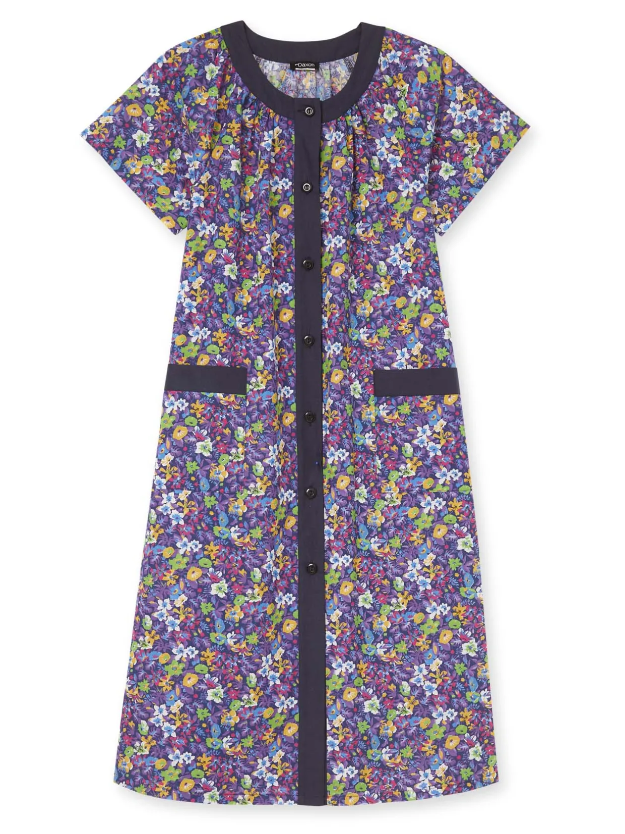 Encolure ronde froncée, patte de boutonnage et haut des poches plaquées, unis. Manches courtes.