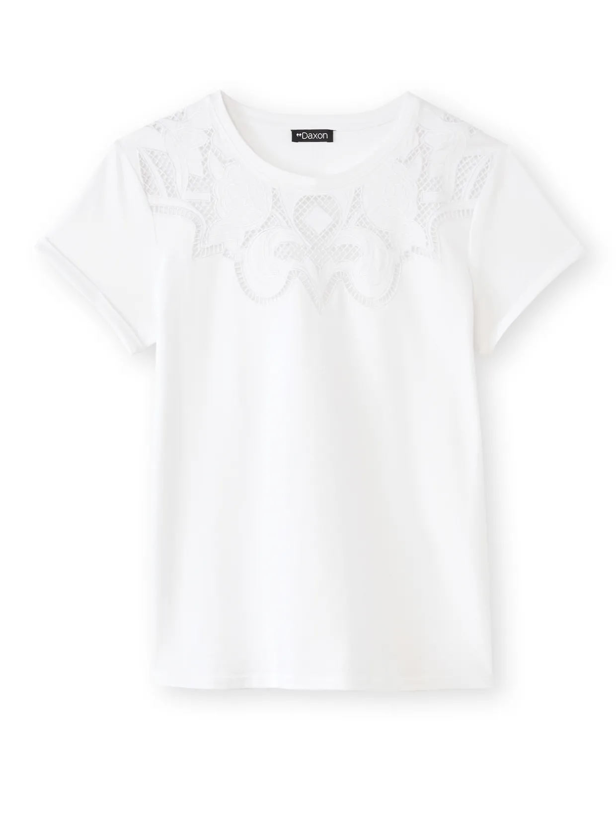 De fines broderies ajourées sous l’encolure ronde font toute la délicatesse de ce tee-shirt en maille pur coton.