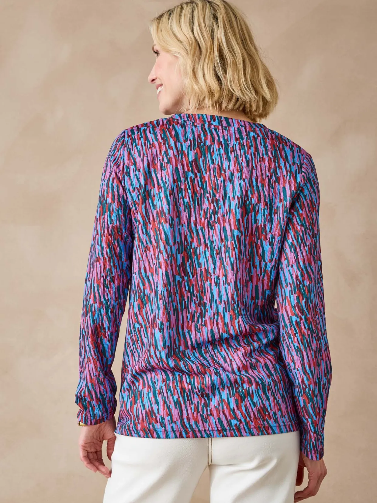 Pour se faire joliment remarquer, ce tee-shirt manches longues a choisi un imprimé très stylé et une maille gaufrée fantaisie… Prête à l’adopter ?