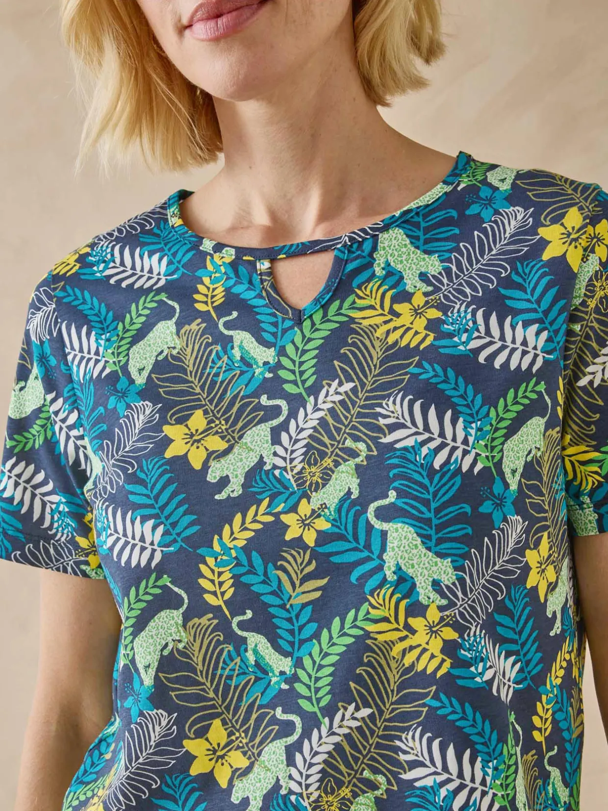 La fantaisie de ce t-shirt coton s’exprime au travers d’une jolie encolure, féminisée par une petite découpe V et par un imprimé au motif « léopards et feuillages » pile dans la tendance !