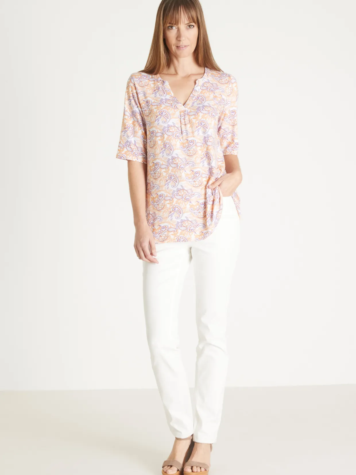 Tunique coupe confortable avec manches aux coudes un peu larges et pli d’aisance sous l’encolure tunisienne devant.