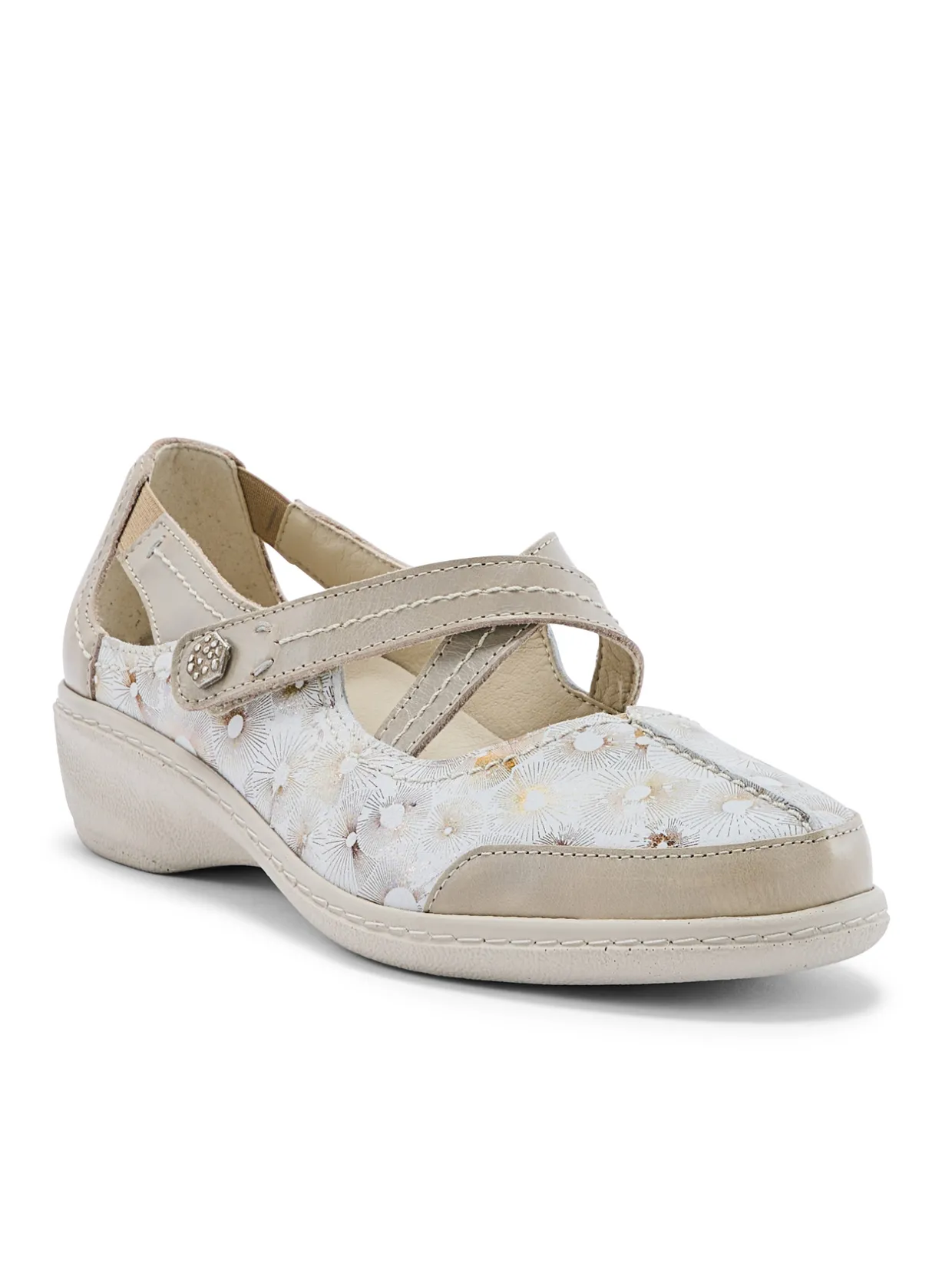 Originalité d’un dessus cuir imprimé pour ces babies PEDICONFORT® munies de 2 brides croisées : l’une fermée par scratch et l’autre munie d’un élastique d’aisance. Confort et facilité d’enfilage assurés !