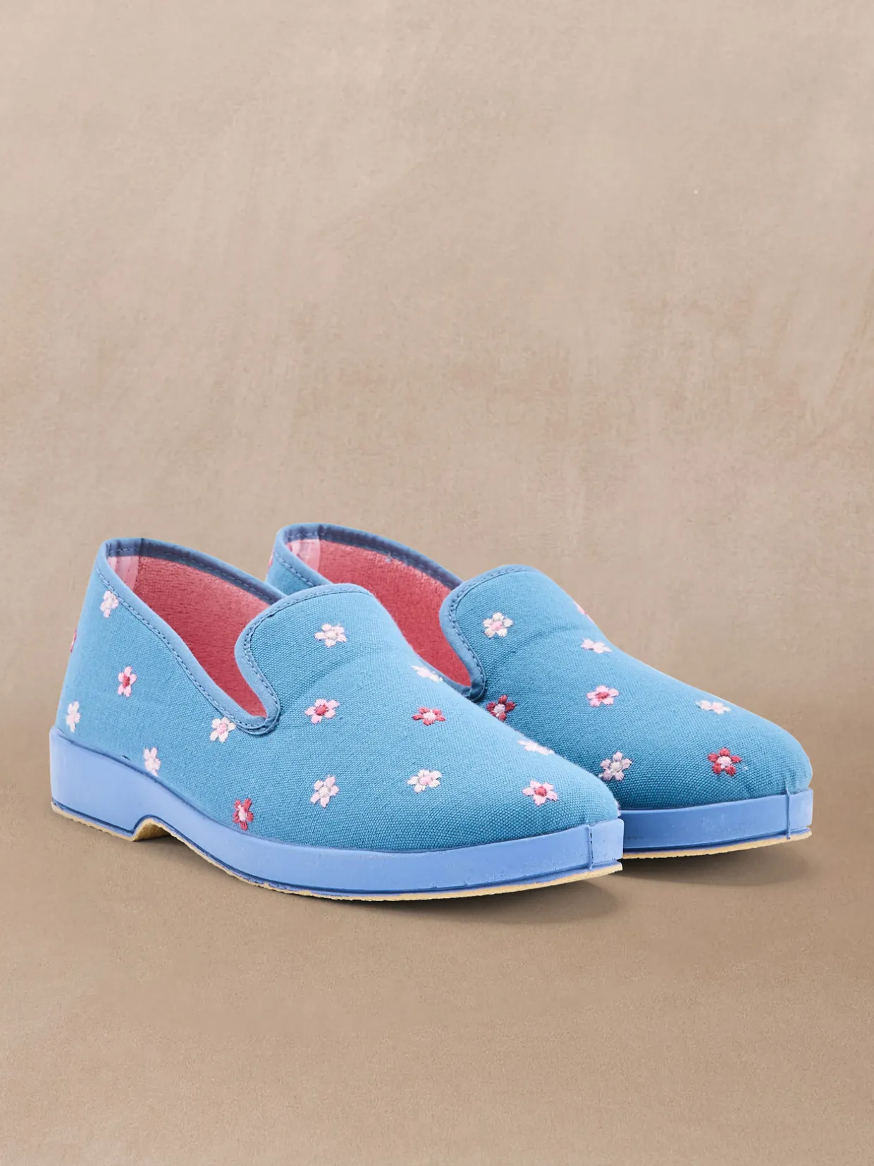 De jolies broderies apportent de la fantaisie et beaucoup de charme à ces charentaises. Grâce à leur intérieur éponge, elles sont agréables à porter aux beaux jours.