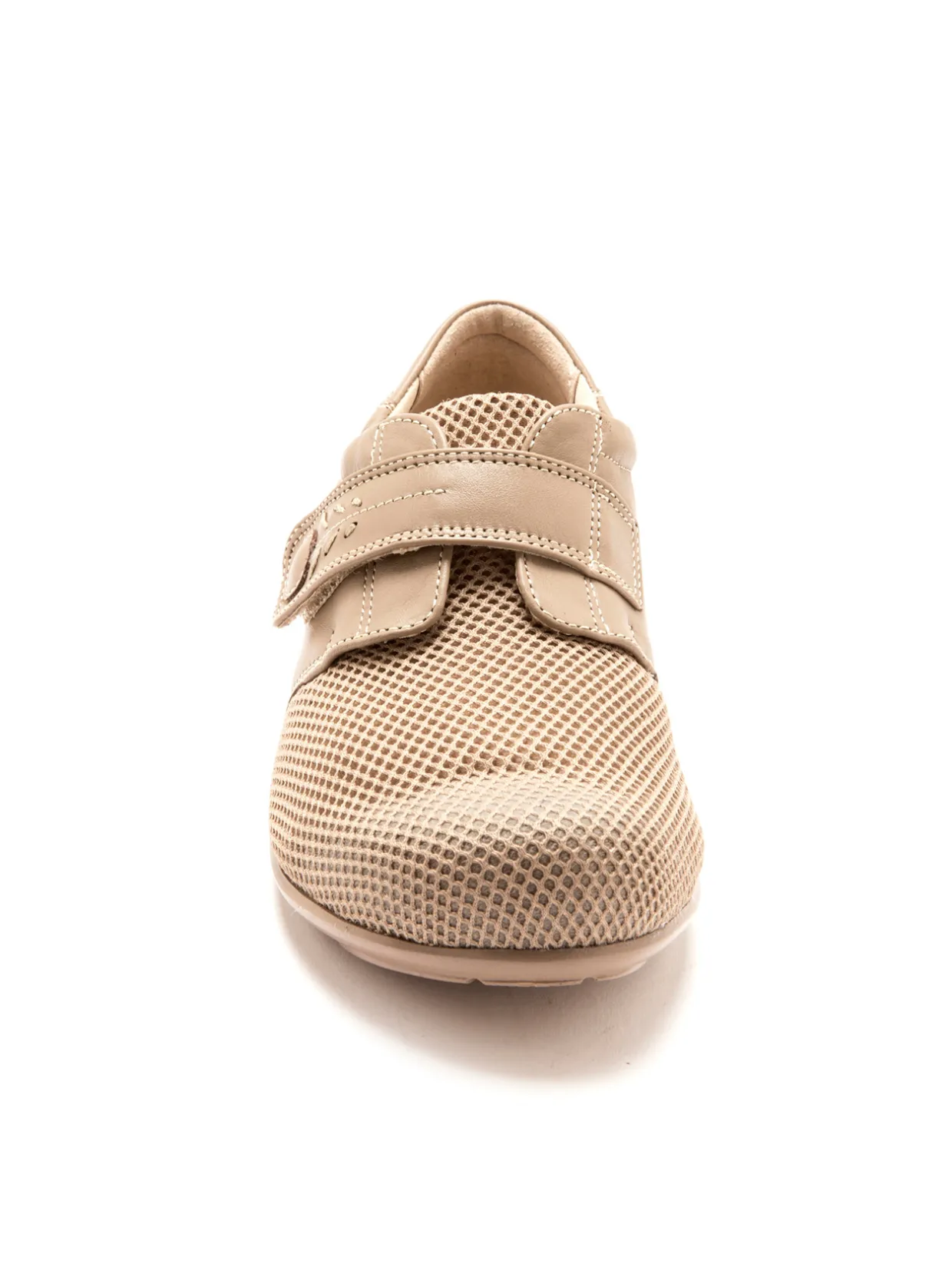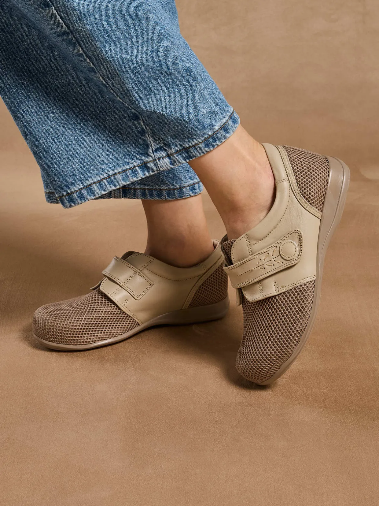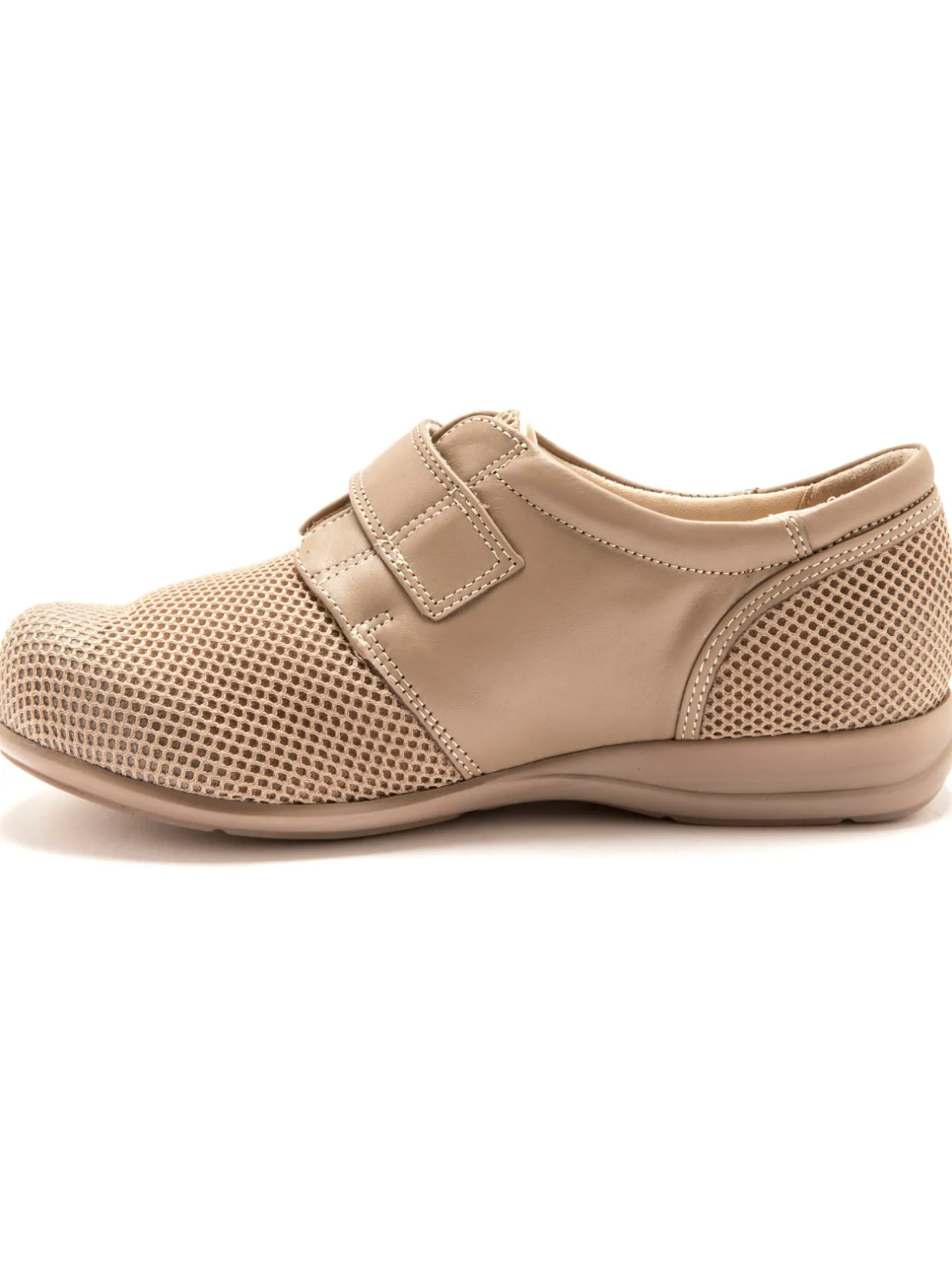 Grand volume intérieur offrant beaucoup d’espace pour les orteils. Dessus : cuir et textile aéré. 1 patte auto-agrippante pour un enfilage aisé, une ouverture totale et une parfaite adaptation à la morphologie de votre pied. Doublure : textile sur mousse. Semelle intérieure : cuir sur mousse épaisse (aérosemelle®), amovible à galbe anatomique.