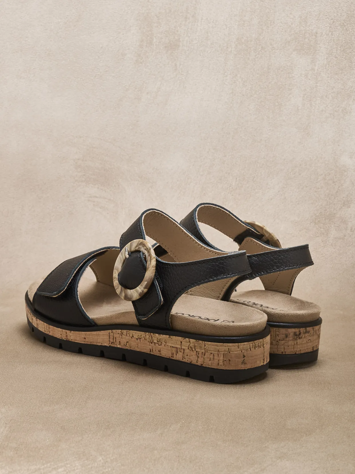 Une double patte scratch, dont l’une rehaussée avec style d’une boucle fantaisie : une double bonne raison d’opter pour ces sandales noires qui jouent aussi l’originalité d’une épaisse semelle compensée (la grande tendance !) avec effets de matières.