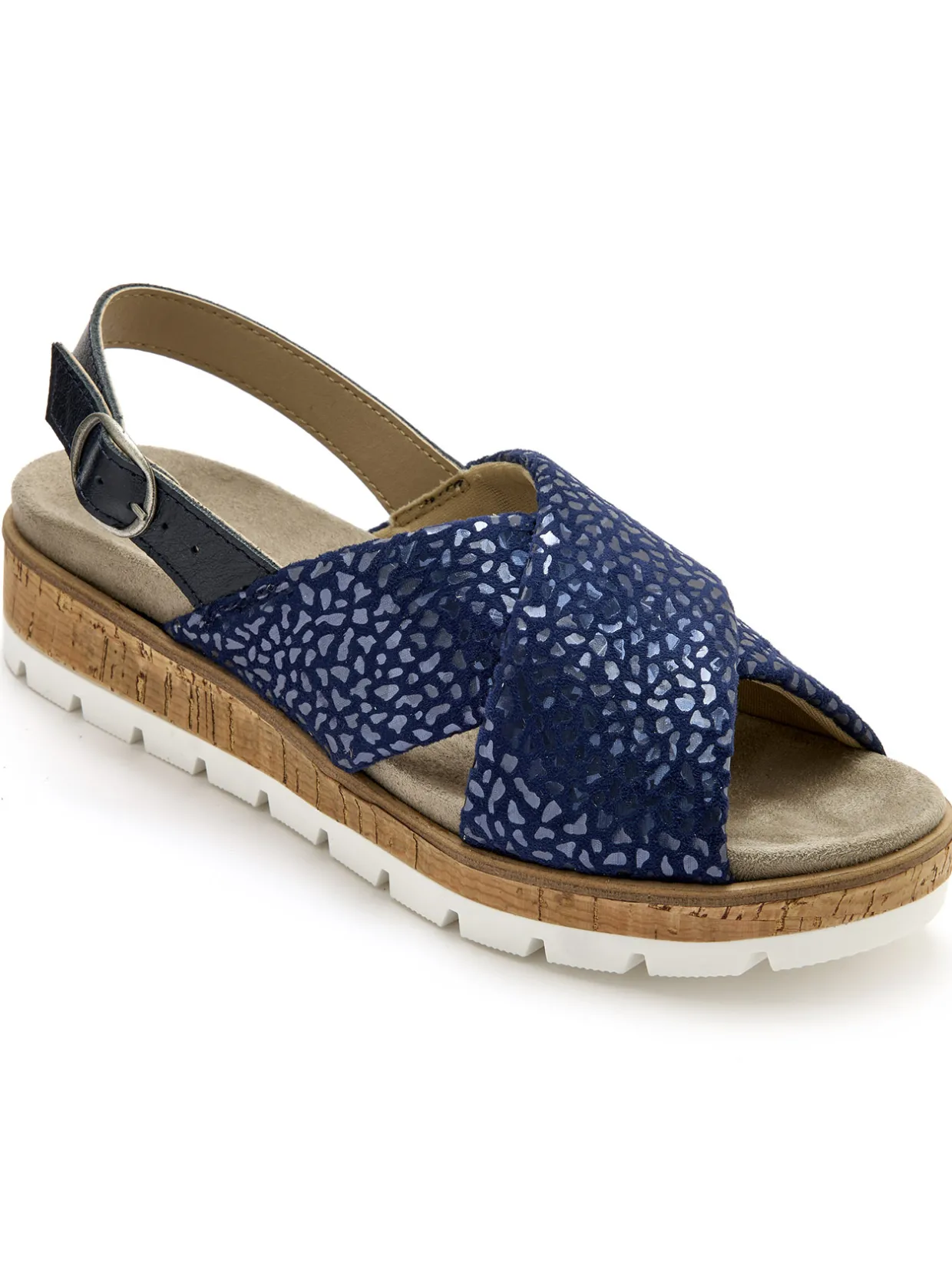Alliance de confort et de fantaisie pour ces sandales PEDICONFORT®, grâce à leurs lanières croisées très confortables en matière extensible tubulaire, rehaussées de petits motifs brillants.