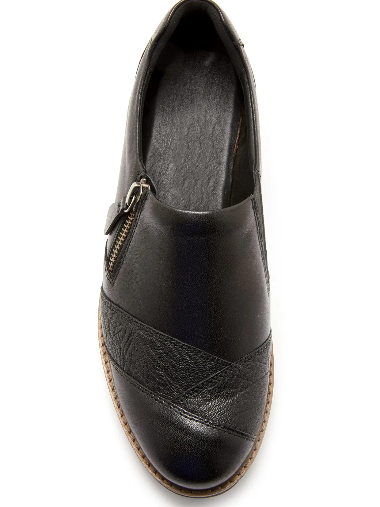 Dessus cuir lisse avec incrustation d’une bande en cuir grainé.