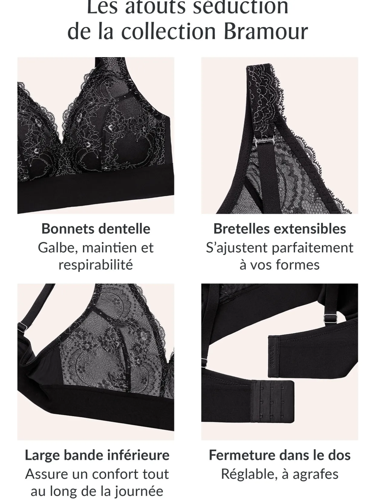 La bralette « Bramour Lexington » de GLAMORISE®, est un bon compromis entre soutien-gorge et brassière. Avec sa large bande élastiquée à la base, elle vous assure un confort absolu.