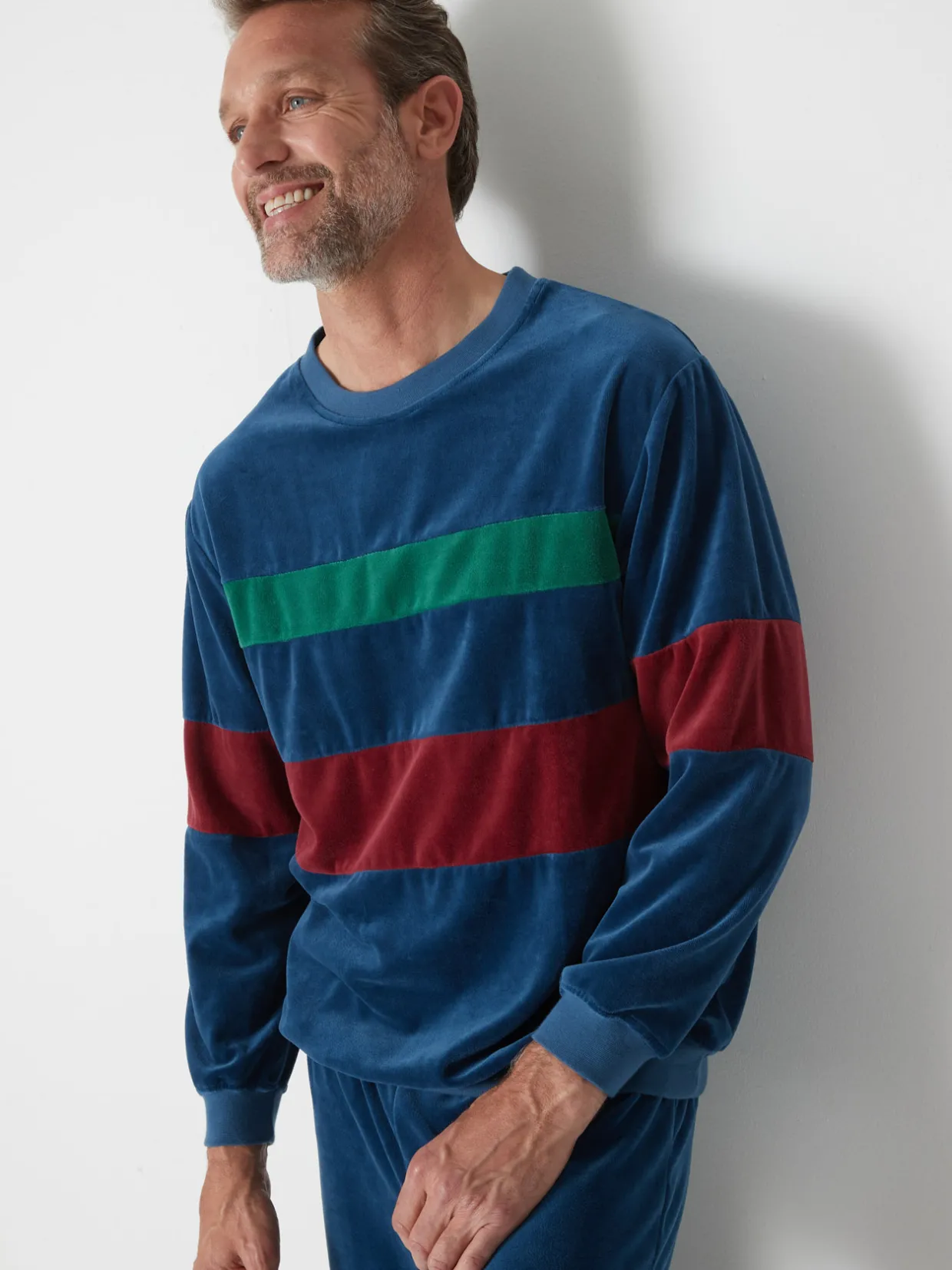 Le haut de pyjama : double bord-côtes à l’encolure ronde et au bas des manches longues. 2 bandes contrastantes sur le devant et une aux manches. Ecusson brodé contrastant sur la poitrine. Dos uni. Longueur 73 cm environ.