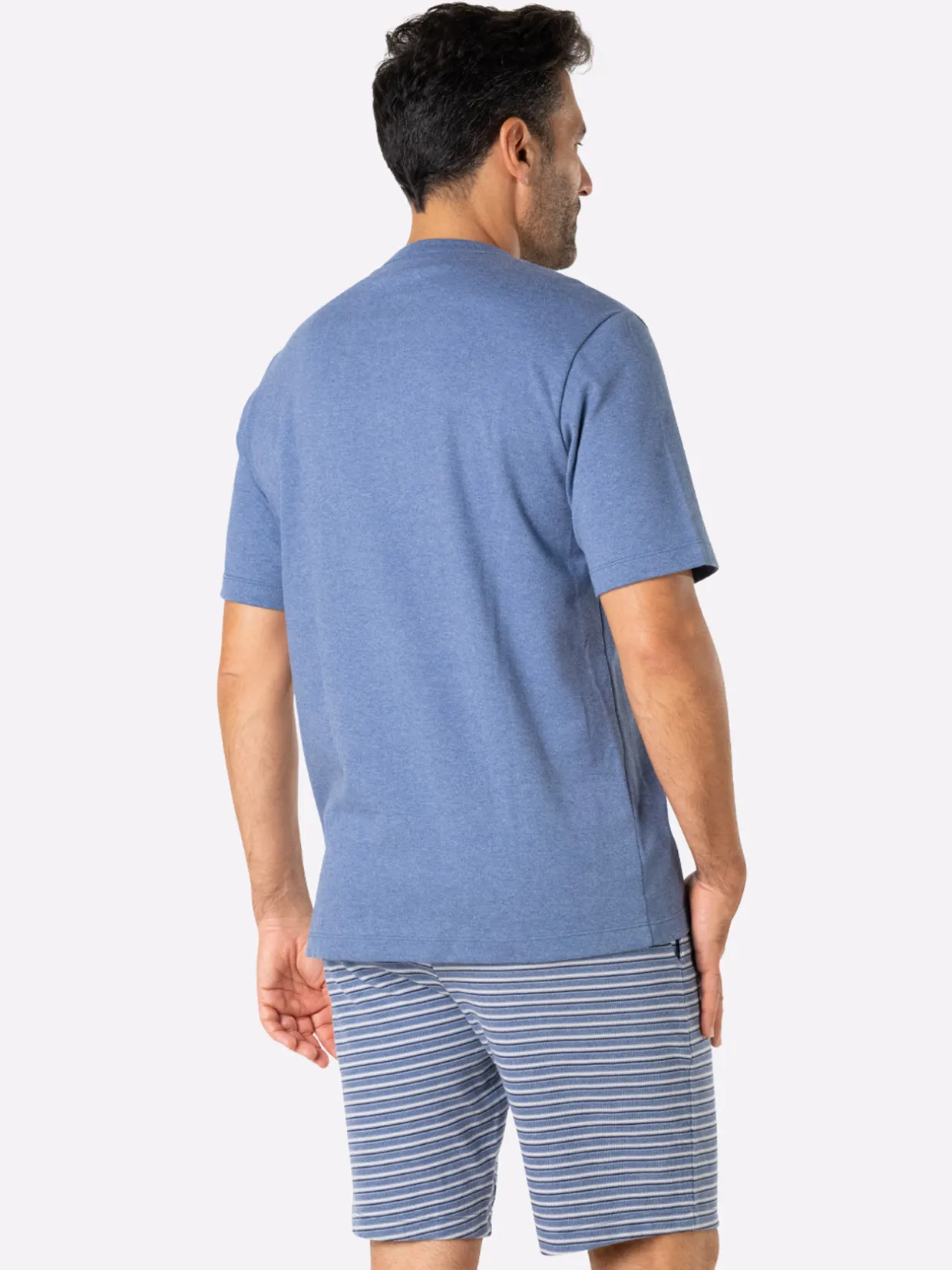 – Bas : Pantalon à rayures fil teint bleu chiné et blanc, poches latérales et cordon de serrage pour un ajustement parfait