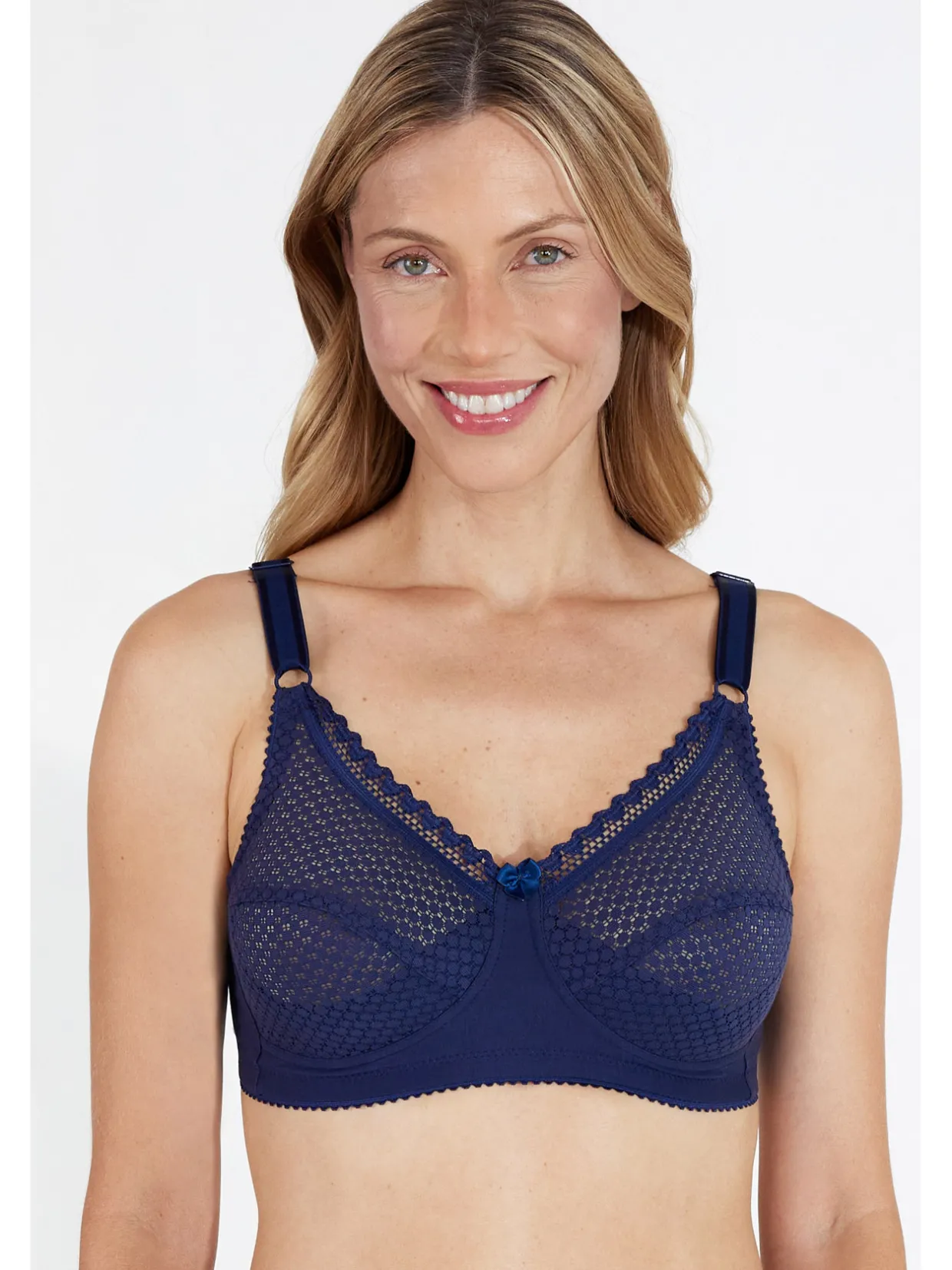 Bonnets dentelle en coton, renforcés dans le bas pour un bon soutien. Larges bretelles élastiques réglables devant. Dos en coton extensible. Double ou triple agrafage dos 3 positions selon les tailles.