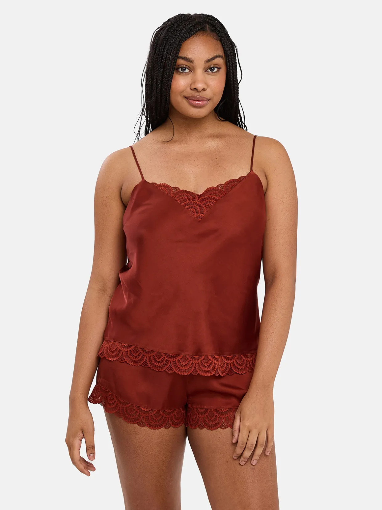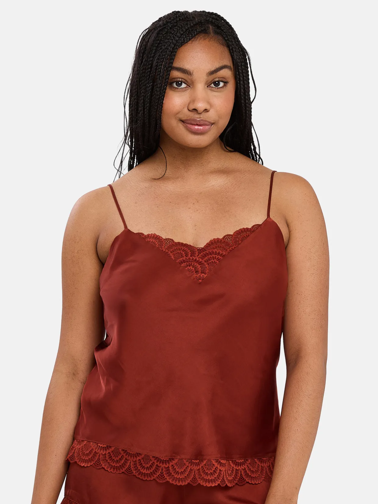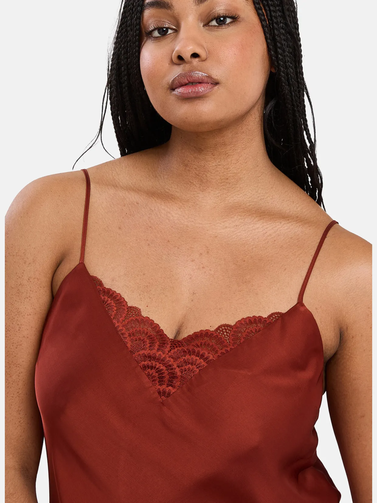 Tissu 100% viscose. Dentelle 90% polyamide, 10% élasthanne. Doublure 100% polyester.