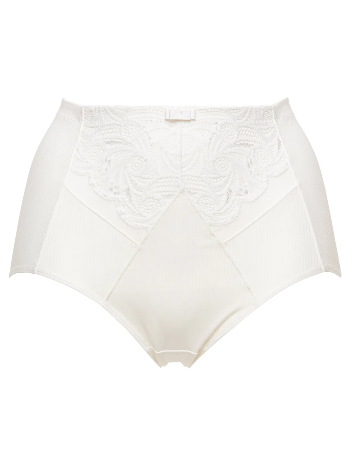 Cette culotte taille haute à forte couvrance affine et galbe le ventre. Cette pièce de lingerie allie une maille texturée et une dentelle au motif en forme de volutes. Les coutures et les empiècements apportent un look chic et moderne à cette culotte confortable aux formes rassurantes et qui affinera vos formes. Large élastique à la taille souligné d’un petit noeud plat texturé. L’avant est doublé pour plus de confort au porté et est surplomber de dentelle et de tulle.