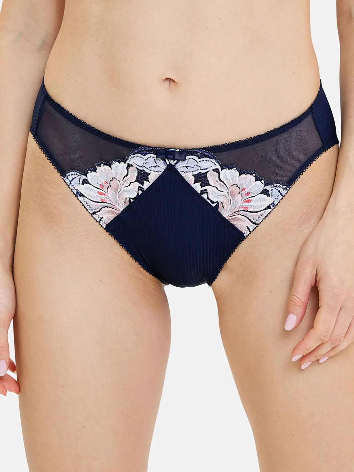 La culotte de notre nouvelle ligne Rosa Fantaisie SANS COMPLEXE se compose d’une dentelle florale imprimée et d’une microfibre ultra douce et fantaisie à effet de rayures. Nous avons ajouté des empiècements de tulle transparent à l’avant pour apporter une touche de légèreté au look final. Ses élastiques à picots lui confèrent encore plus de fantaisie.