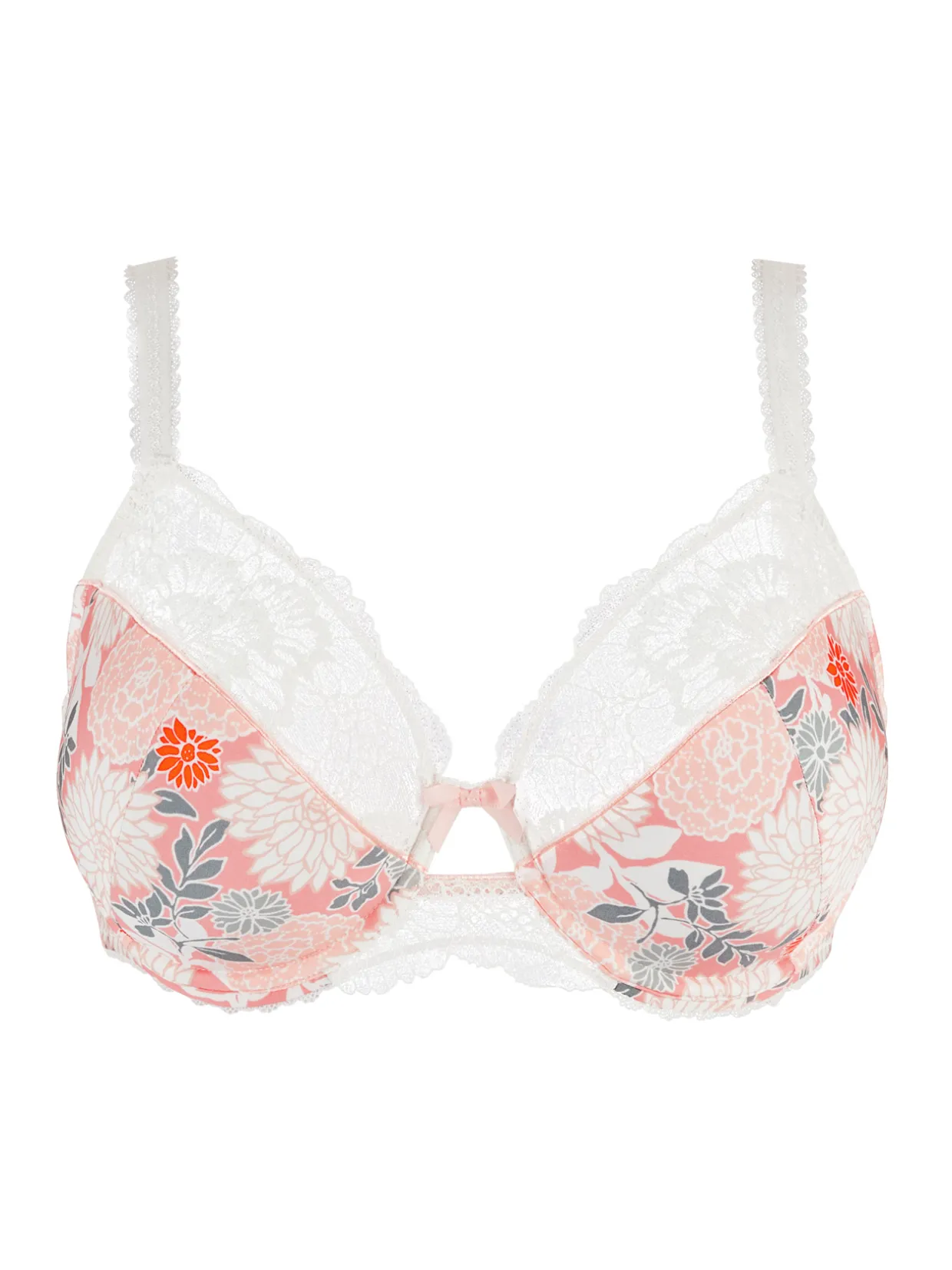 Découvrez le soutien-gorge Aurélie SANS COMPLEXE, la fusion parfaite entre dentelle délicate et microfibre imprimée au motif floral.