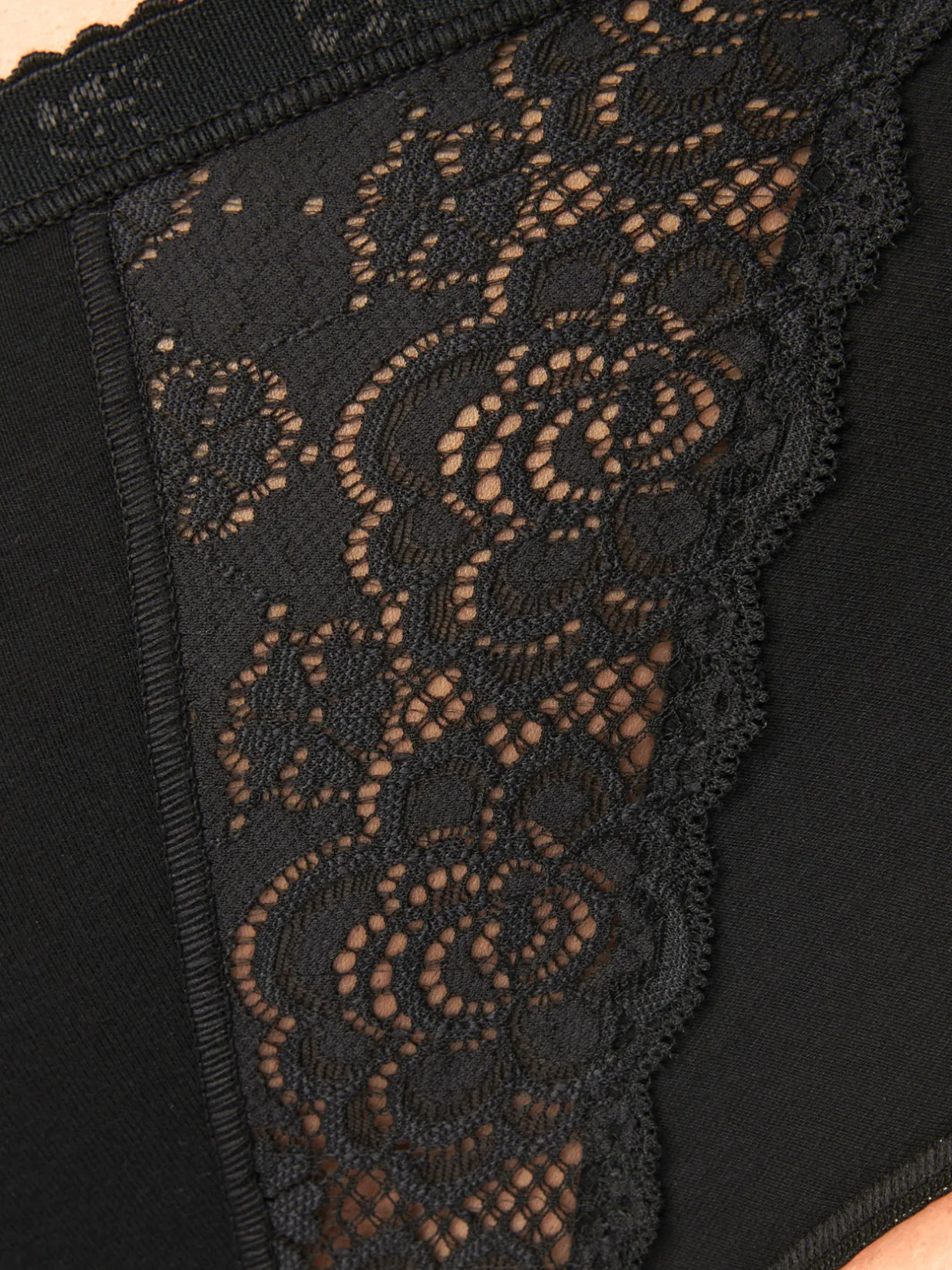 Maille douce et souple incrustée de dentelle extensible devant, 85% coton, 10% polyamide, 5% élasthanne.